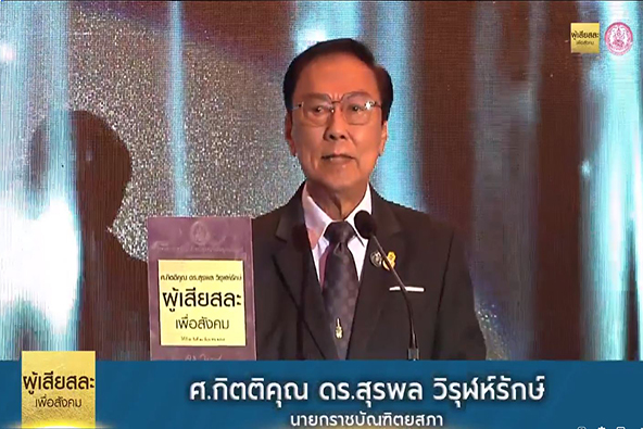 ศาสตราจารย์กิตติคุณ ดร.สุรพล วิรุฬห์รักษ์ กล่าวในพิธีมอบรางวัลว่า “สิ่งที่ท่านยึดถือในการสอนเยาวชนระดับอุดมศึกษาของชาติ คือ พระธรรมะของพระพุทธเจ้า “ 5 3 1” อันได้แก่ 5 คือ ขัณฑ์ 5 ได้แก่ รูป เวทนา สัญญา สังขาร วิญญาณ รูป คือ ต้องมีความสมบูรณ์ทั้งสุขภาพกาย สุขภาพจิต เวทนา คือ การฝึกพัฒนาและควบคุมอารมณ์ มีความสำรวม สัญญา คือ จำได้ หมายรู้ ฝึกสมอง ให้สามารถกลั่นกรอง จดจำ และเรียนรู้ได้ตลอดชีวิต สังขาร ต้องรู้จักตัวเองว่าอยากทำ อยากเป็น อยากอยู่ อย่างไร และวางแผนเตรียมตัวด้วยความวิริยะ อุตสาหะ และวิญญาณ ต้องมีวิจารณญาณในการับรู้และเรียนรู้ตลอดเวลา 3 คือ ปริยัติ ปฏิบัติ ปฏิเวธ ปริยัติ หมายถึง ต้องเรียนรู้ หาความรู้อยู่ตลอดเวลาในเรื่องทฤษฎี ปฏิบัติ เมื่อรู้แล้ว ต้องทำให้ได้ ปฏิเวธ คือ การใช้ความรู้เชาวน์ปัญญาแก้ปัญหาได้ และ 1 คือ อัตตา หิ อัตตโน นาโถ คือการพึ่งตัวเอง ออกแบบชีวิตของตัวเองให้มีความพร้อมในทุกมิติ ทั้งในยามสุขและยามทุกข์ สิ่งนี้จะทำให้สังคมไทยมีความมั่นคงแข็งแรง ไปข้างหน้าได้อย่างมีคุณภาพ”