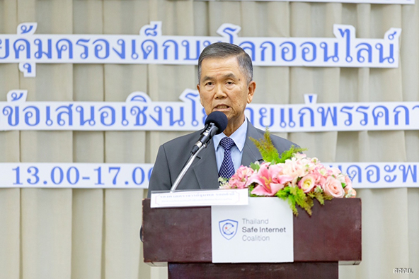 รองศาสตราจารย์ จุมพล รอดคำดี ประธานเครือข่ายเสริมสร้างอินเทอร์เน็ตปลอดภัยประเทศไทย ขึ้นกล่าวเปิดกิจกรรม การเสวนาเปิดวิสัยทัศน์ "อนาคตเด็กไทย บนโลกออนไลน์"