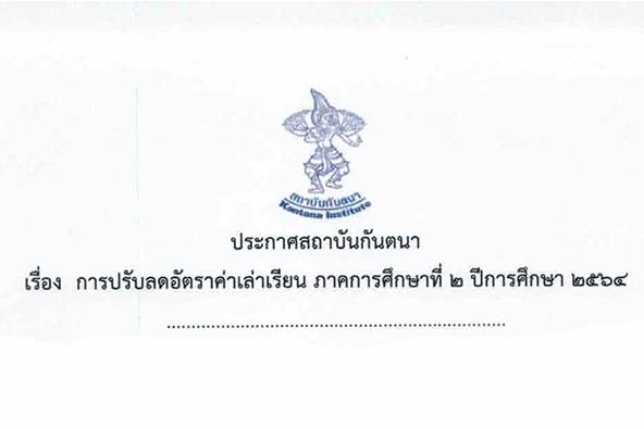 ประกาศสถาบันกันตนา เรื่อง การปรับลดอัตราค่าเล่าเรียน ภาคการศึกษาที่ 2 ปีการศึกษา 2564