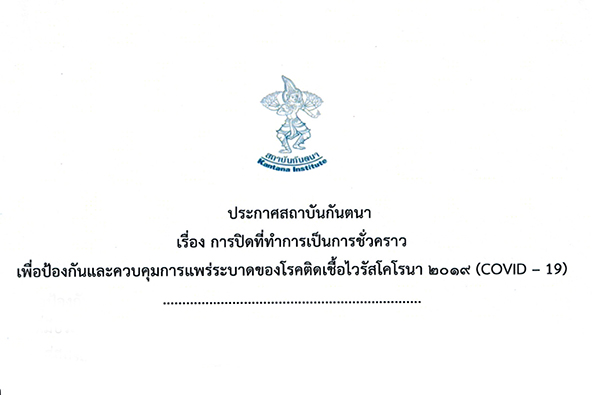 ประกาศสถาบันกันตนา - การปิดที่ทำการเป็นการชั่วคราว เพื่อป้องกันและควบคุมการแพร่ระบาดของโรคติดเชื้อไวรัสโคโรนา 2019 (Covid - 19)