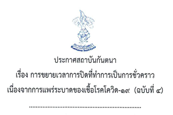 ประกาศสถาบันกันตนา - การขยายเวลาการปิดที่ทำการเป็นการชั่วคราวเนื่องจากการแพร่ระบาดของเชื้อโรคโควิด-๑๙ (ฉบันที่ ๔)